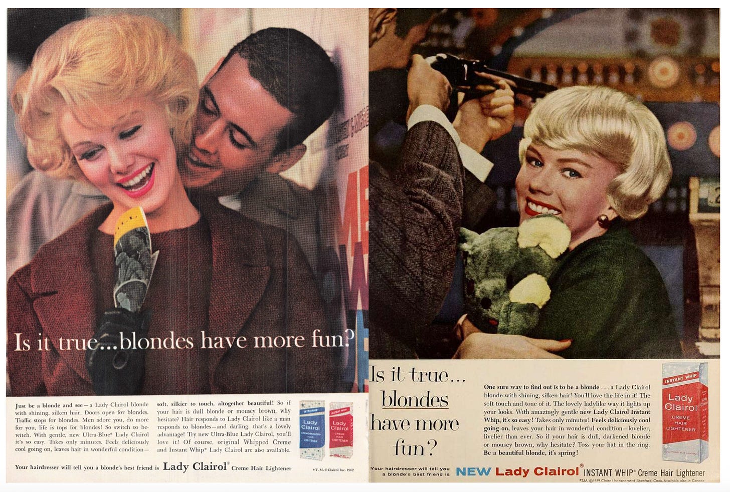 Platinum blondes in early Hollywood were often achieved using industrial bleaching agents not meant for cosmetic use, harsh enough to burn the scalp or cause hair to break off entirely, but the damage stayed off screen. What remained was the image. Actresses weren’t just cast, they were constructed. Hair lightened, image controlled, persona shaped into something instantly recognisable, reinforced by slogans like “blondes have more fun,” a line that originated in a 1960s hair dye campaign and slowly hardened into cultural belief.
